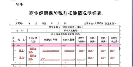 有扣繳義務(wù)人的個(gè)人自行購(gòu)買、單位統(tǒng)一組織為員工購(gòu)買或者單位和個(gè)人共同負(fù)擔(dān)購(gòu)買符合規(guī)定的商業(yè)健康保險(xiǎn)產(chǎn)品,扣繳義務(wù)人在填報(bào)《扣繳個(gè)人所得稅報(bào)告表》或《特定行業(yè)個(gè)人所得稅年度申報(bào)表》時(shí),應(yīng)將當(dāng)期扣除的個(gè)人購(gòu)買商業(yè)健康保險(xiǎn)支出金額填至申報(bào)表“稅前扣除項(xiàng)目”的“其他”列中(需注明商業(yè)健康保險(xiǎn)扣除金額),并同時(shí)填報(bào)《商業(yè)健康保險(xiǎn)稅前扣除情況明細(xì)表》